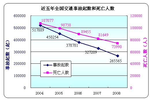 2008年,全国共发生道路交通事故265204起,造成73484人死亡、304919人受伤,直接财产损失10.1亿元。与2007年相比,事故起数减少62005起,下降19%;死亡人数减少8165人,下降10%;受伤人数减少75523人,下降20%;直接财产损失减少1.9亿元,下降15.8%。其中,发生一次死亡3人以上道路交通事故1290起,同比减少190起,下降12.9%;发生一次死亡5人以上道路交通事故250起,同减少17起,下降6.4%;发生一次死亡10人以上特大道路交通事故29起,同比增加3起。道路交通事故万车死亡率为4.3,同比减少0. 8。