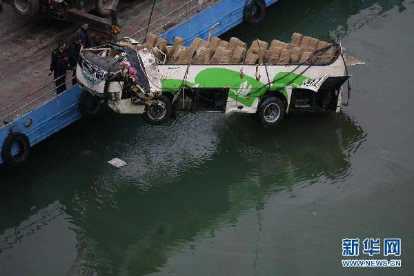 10月3日,湖北兴山“10·1”特大道路交通事故中坠河的客车被打捞出水。  10月1日15时许,湖北省荆州市九州旅游汽车运输有限公司驾驶人熊某驾驶该公司鄂D14566号大型客车,核载35人,实载35人,从湖北省荆州市开往神农架,行至宜昌市兴山县境内312省道,车辆失控撞坏右侧波形护栏冲出路面,坠入香溪河中,造成16人死亡,19人受伤。  新华社发
