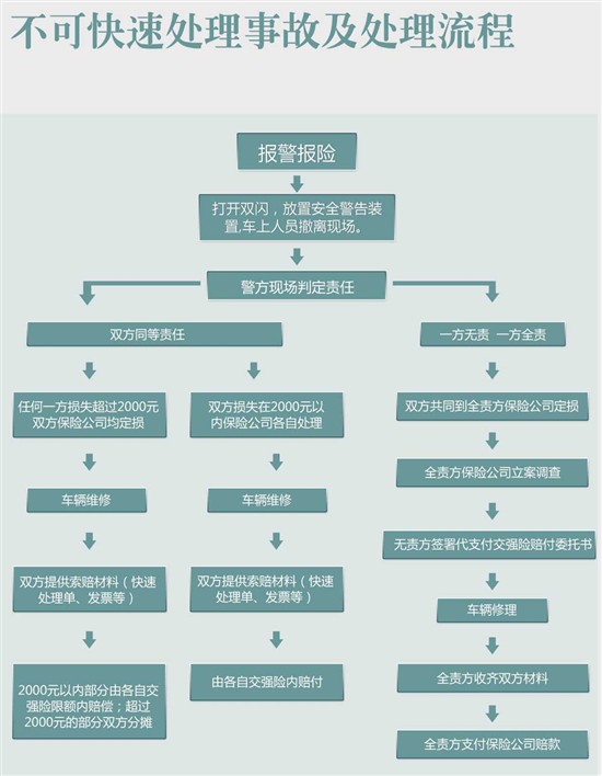 已买保险但未上牌: 保险生效之后,在去上牌的路上发生事故,这时车辆虽然还没有拍照,但在保险已经生效的情况下,消费者可以得到理赔。 停车场/地库: 停车场/地库等位置虽然并不属于正常道路,但当发生事故时依然按照道路法规进行责任划分。 4S店修车: 如果您的车辆寄存在4S店进行保养或维修时发生碰撞,建议您与4S店协商而不是走个人保险,因为虽然走保险不会产生费用,但对第二年的保费会有所影响。 撞公交车: 在公交车道内(有效时间段)社会车辆与公交车发生事故,社会车辆全责,在非公交车道或非有效时间内,公交车与社会车辆发生碰撞按正常交通事故处理划分责任。 驾驶员碰撞家庭成员: 当事故中的受伤一方为驾驶员的直系亲属时,保险公司不予理赔。有以下行为的,驾驶者要承担全部责任 1:闯红灯 2:装载的货物飘散、遗撒 3:未按规定装载货物 4:未按规定牵引车辆 5:未按指示灯方向通行 6:驶入禁行车道 7:违法掉头:在禁止掉头的路段掉头,发生事故要负全部责任 8:三轮车摩托车驶入禁行路 9:为服从交警指挥 10:未避让特种车辆 11:未避让作业车辆 12:进主路车辆为让行主路内的车:准备进主路车辆未让行主路内的车 要承担全部责任 13:辅路车辆未让出主路的车:在辅路行驶车辆未让行驶出主路的车 要承担全部责任 14:进出停车泊位的车未让行 15:坡路未让行 如果事故双方不能通过交通事故快速处理解决,或事故双方未能达成一致,那就只能等交警到现场进行处理了,下面的树形图就是不可快速处理事故的基本处理流程。