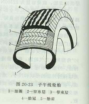 (2)子午线轮胎 图20—23所示为子午线轮胎的构造。它由帘布层2、带束层3、胎冠4、胎肩5和胎圈l组成,并以带束层箍紧胎体。其特点是: