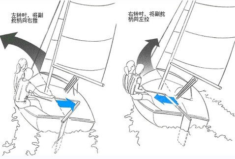 若想让帆船向某个方向运动,您只需要在相反的方向推拉舵柄即可。移动舵柄向右,则船左转,移动舵柄向左,则船向右转。转向风的方向有时称为向上风,转离风的方向有时称为向下风。 驾驶时,舵手的双手应握在一起,并不时地观察帆和船前波浪和风的情况,也不要忘了在帆杆下观察从下风向到来的船只。 你可能只想用舵柄在驾驶,但是副舵柄可以让你坐得更靠甲板外。