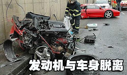 法拉利F355属于法拉利车系的入门街跑,在此次事故中车尾受到了斯柯达Superb的猛烈撞击,一味最求车身轻量化的法拉利F355车身刚性不足,导致车尾放置发动机的位置与车身脱离。