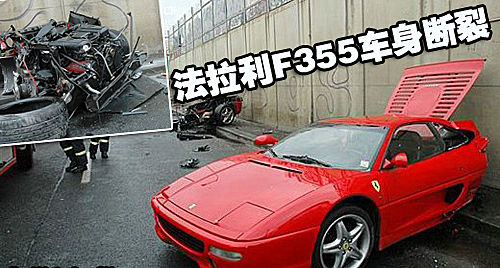 跑车相对比较轻的车身如果与其它车辆发生碰撞,往往“很受伤”的就是跑车了。在形形色色的跑车车祸中,车身断裂的情况屡见不鲜。下面这辆经典的法拉利F355就被一辆斯柯达Superb拦腰撞断。