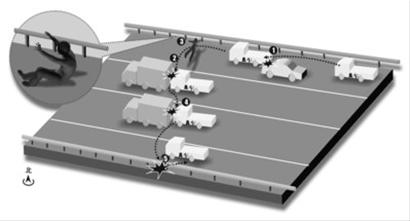卡车连环撞击示意图。①卡车撞轿车②再撞厢车③卡车司机飞出④卡车第三次撞另一辆厢车⑤卡车撞上隔离带停下